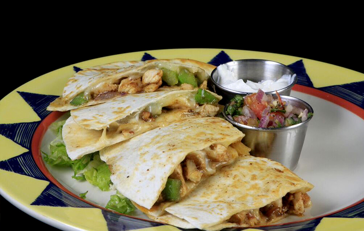 Choose between chicken and steak quesadillas cut into pieces; comes with rice and beans, sour cream, pico de gallo, chips and salsa.